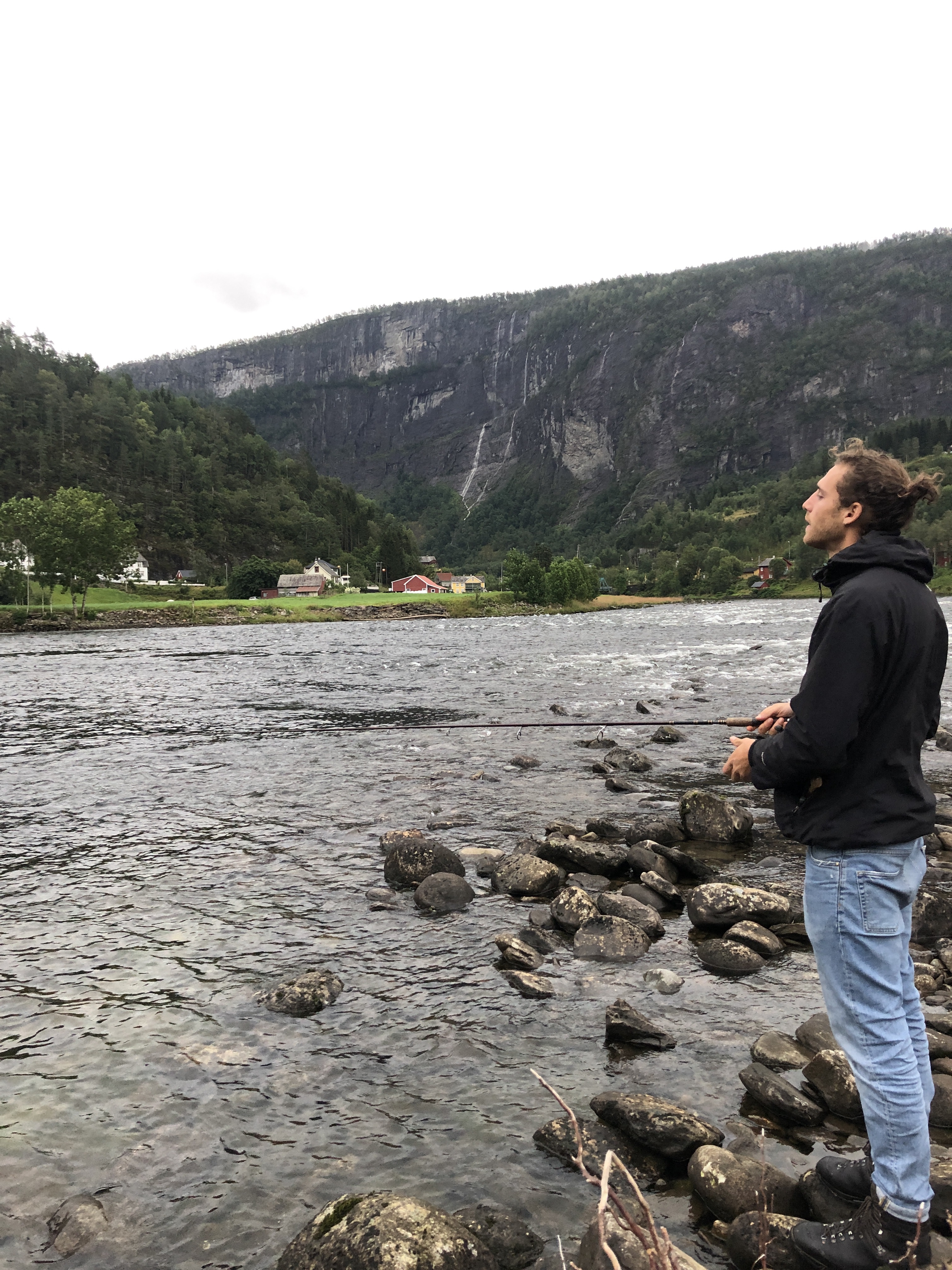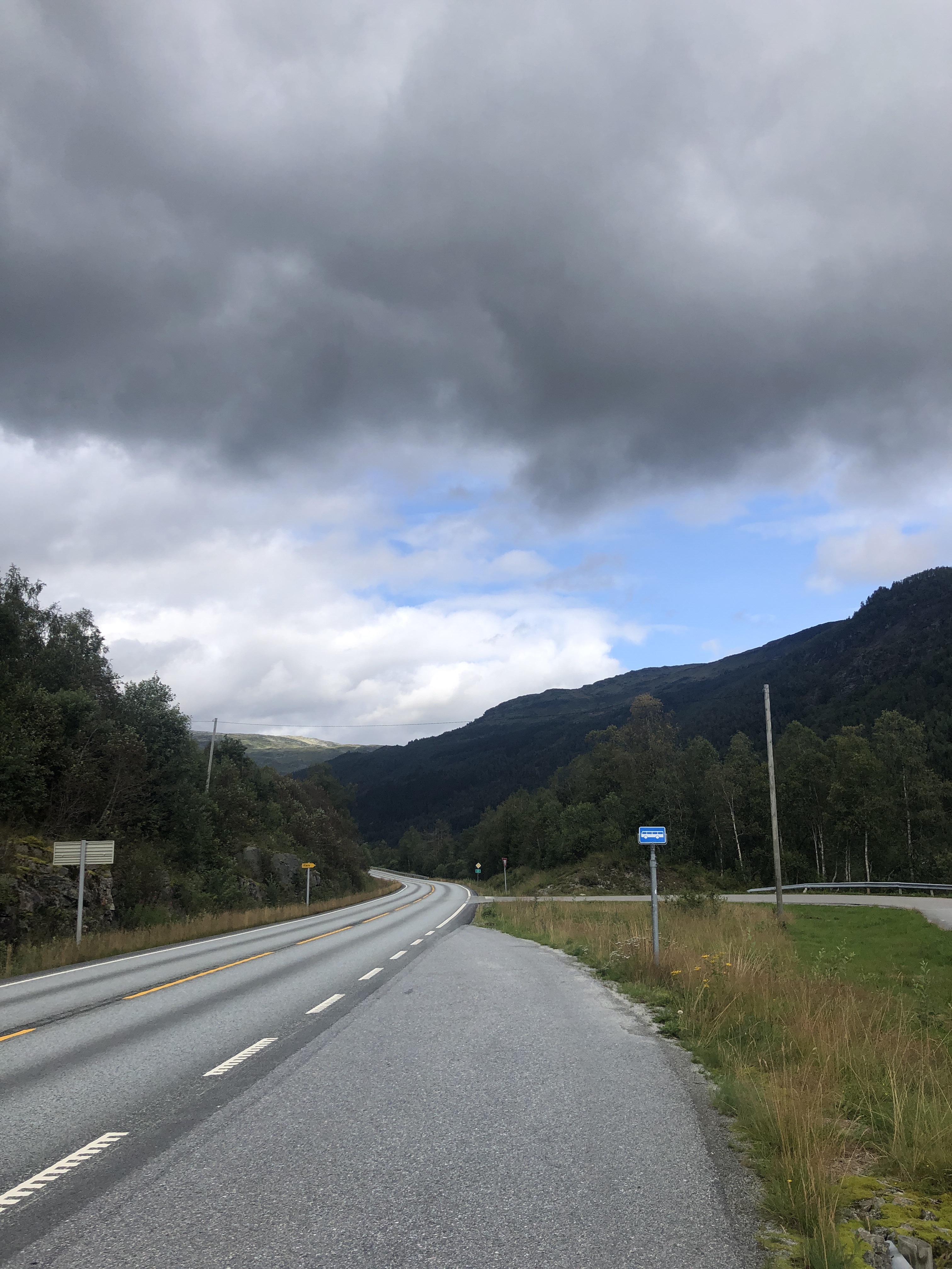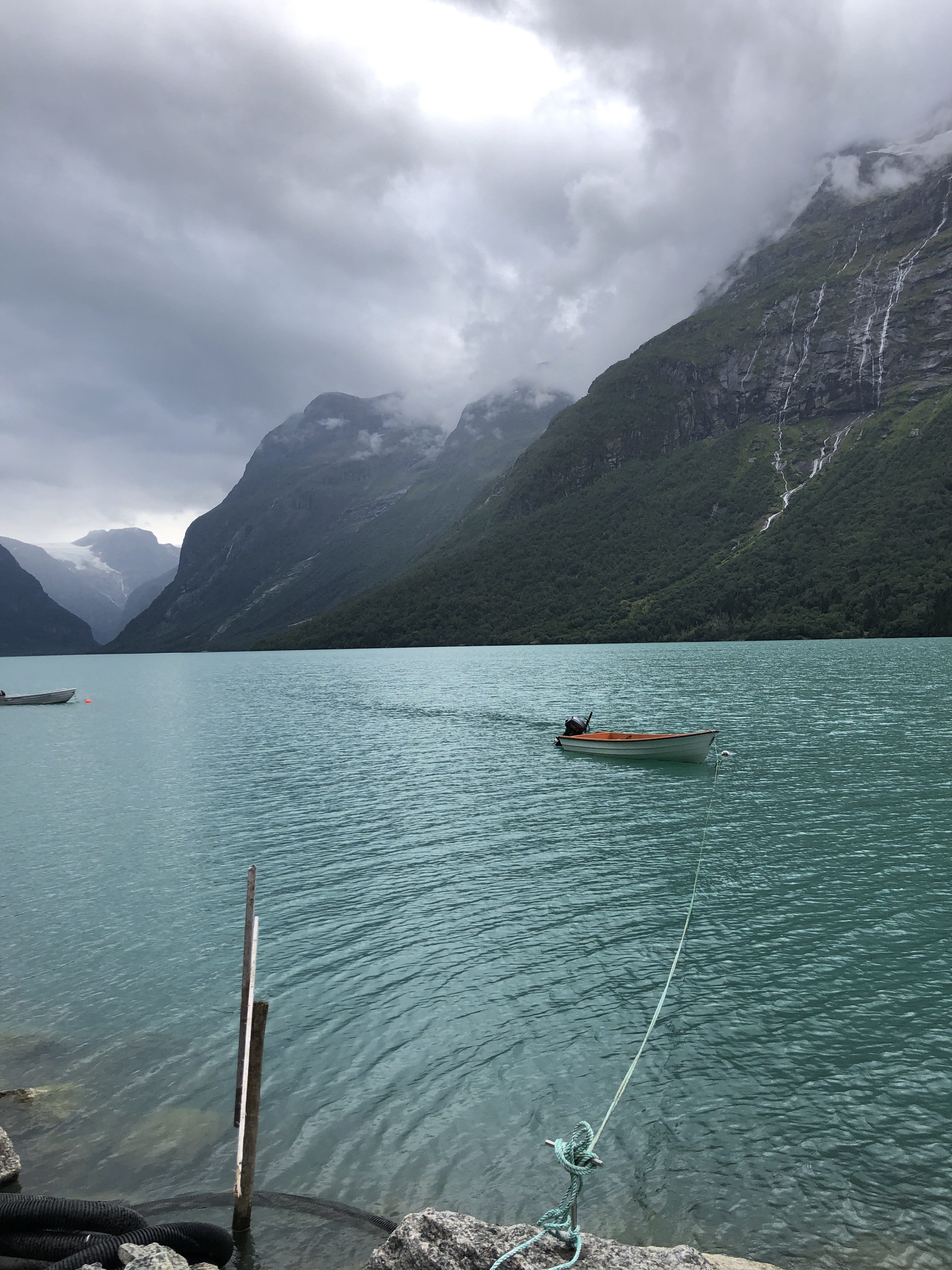 Mit aufgetankten Kräften und neuer Motivation stellten wir uns diesen Morgen wieder an die Strasse. Dass uns zum ersten Mal, seit wir in Norwegen sind, die Sonne ins Gesicht schien, konnte nur Gutes verheissen. Doch wiedermal mussten wir uns in Geduld üben…dies nahmen wir, in Anbetracht dessen, dass wir uns mitten im Nirgendwo befanden und vermutlich relativ verloren daherkamen, nur ungläublig zur Kenntnis. Wie konnten wir nur so lange ignoriert werden? Etliche Fahrzeuge und Minuten später hielt dann endlich das erste Fahrzeug für uns an. Während der Fahrt stellte sich der Fahrer als Kayd heraus, ein Norweger mittleren Alters und ehemaliger Kondukteur der norwegischen Bahn. So fuhren wir mit Kayd durch diese westnorwegische Landschaft mit ihren Flüssen, Bergen, Pässen, Gletschern und natürlich Fjorden. Kayd erzählte uns, dass er und seine Frau vor vier Jahren einen Hof gekauft haben, wo sie sich momentan ein neues Leben aufbauen. Sie beide hatten genug vom Stress und der Herumhetzerei in Oslo, sie sehnten sich nach einem andern Rythmus, nach einem anderen Lebensstil, näher bei der Natur, näher bei sich selbst. Daher versuchen sie es nun mit Bauern…zum Glück für uns, denn als er uns aufgabelte, war er auf dem Rückweg von der Besichtigung einiger Kashmirziegen, die er sich demnächst zulegen will. Nach ca. zwei Stunden Fahrt, einer Einladung zu sich nach Hause, interessanten Gesprächen und vielen Informationen zur Landschaft die wir durchquerten, fuhr uns Kayd zu einem Campingplatz in der Nähe von Loen. Der Anblick war bezaubernd: ein gletscherblauer See umgeben von steil aufragenden Bergen die von Gletschern bedeckt sind! Ein Ort wie aus dem Bilderbuch! In der Schweiz wäre er wohl von Touristen überrannt, hier ist er wohl ein ziemlicher Geheimtipp. So dankten wir Kayd für die Fahrt und liessen uns für den Rest des Tages an diesem Ort, an dem sich es sich durchaus auch länger aushalten liesse, nieder.